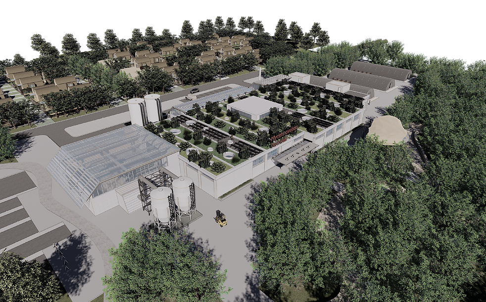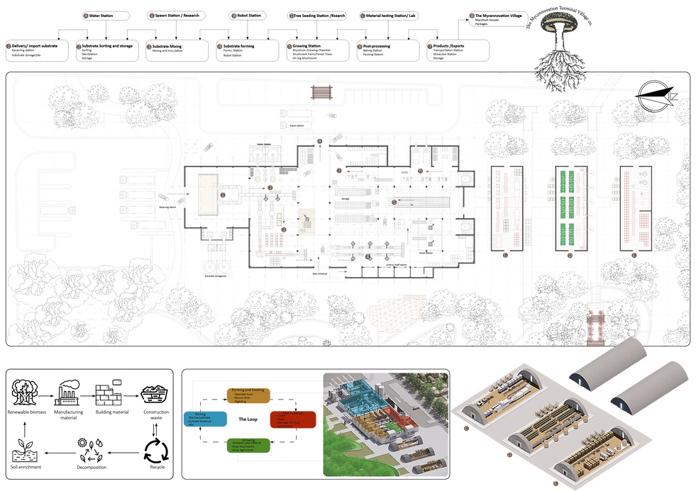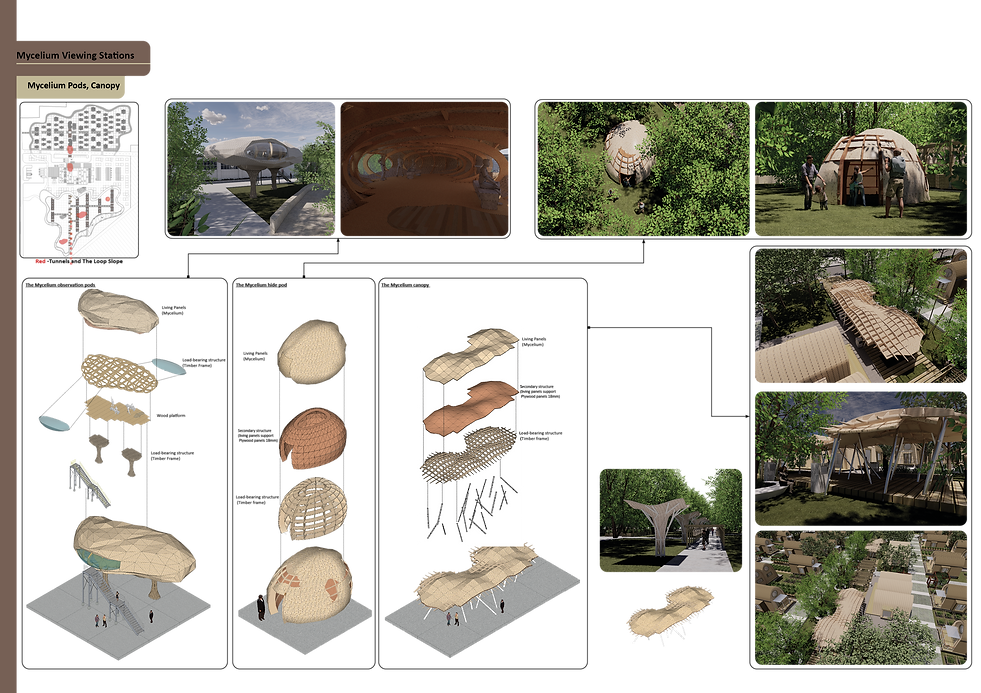This zone would focuses on the construction of self-build mycelium houses for refugees and people in need of housing, comprising: A cluster of one-bedroom and two-bedroom houses, Open market and Showcase of pods and canopies made of Mycelium